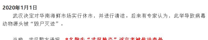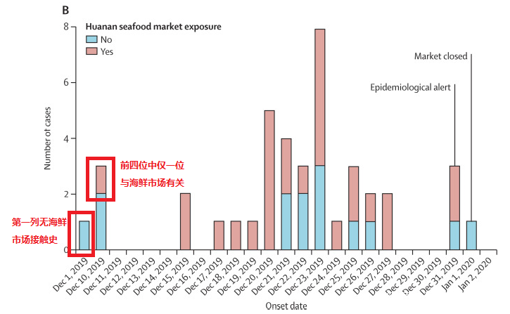 但《柳葉刀》上發表的論文明確提到12月1日即有第一例患者且與華南海鮮沒有聯繫。最開始傳染的41宗案件中有13宗與海鮮市場無關。