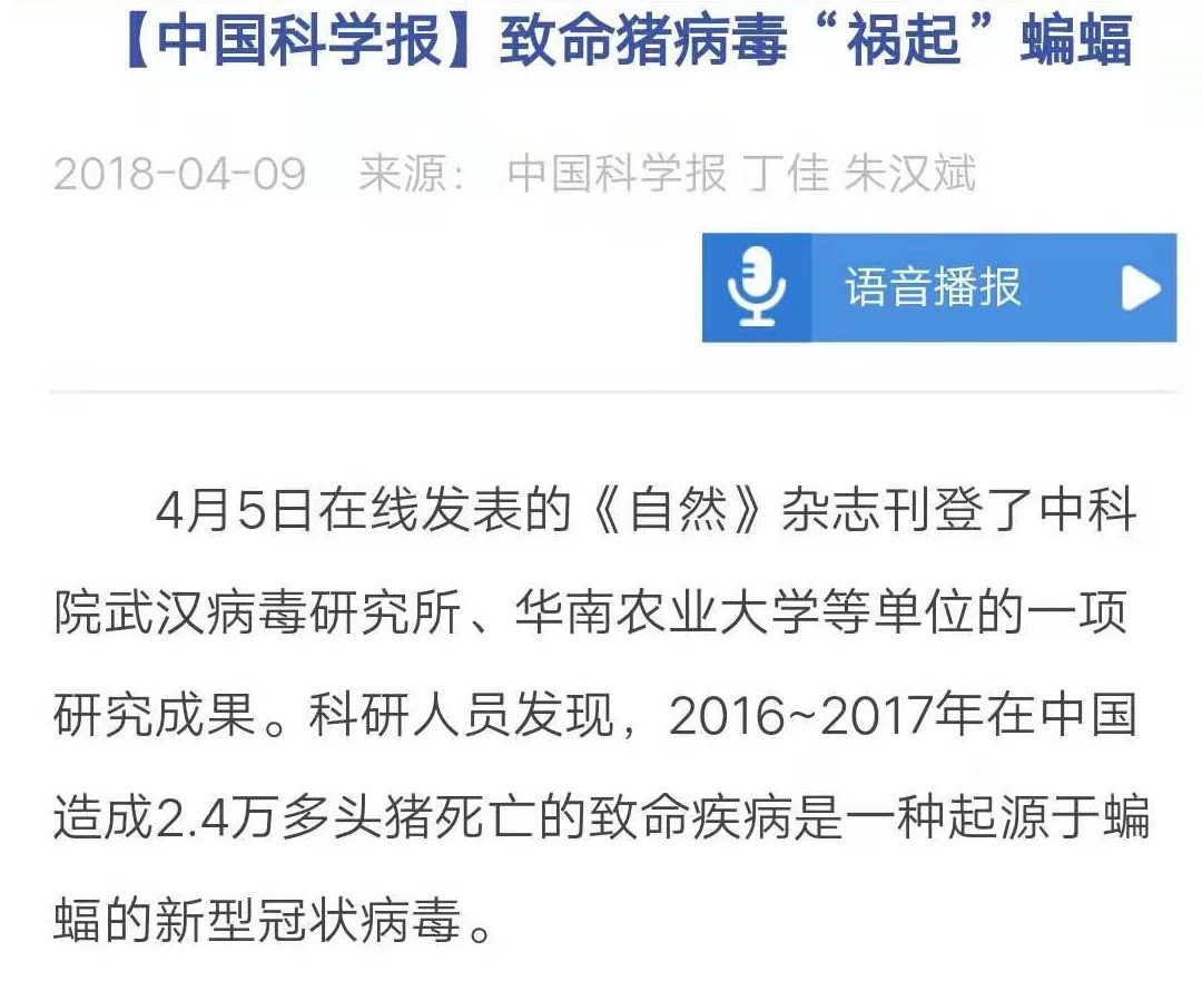 這是16~17年間發生於廣東的一場疫情,離湖北武漢甚遠。當時明確稱這種新病毒為新型冠狀病毒SADS(與SARS同宗但有區別),起源於菊頭蝠。當時未發現能人傳人,但已能在蝙蝠家畜間傳染。不排除進一步變異後可人傳人。
