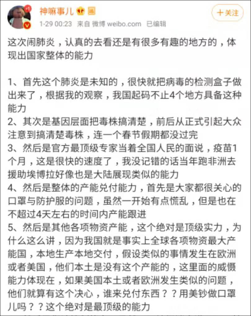這次鬧肺炎,認真的去看還是有很多有趣的地方的,體現出國家整體的能力