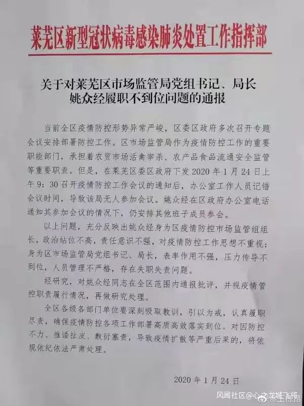 在山東,萊蕪區市場監管局黨組書記、局長姚眾經由於在疫情防控工作中履職不到位,被全區通報批評。