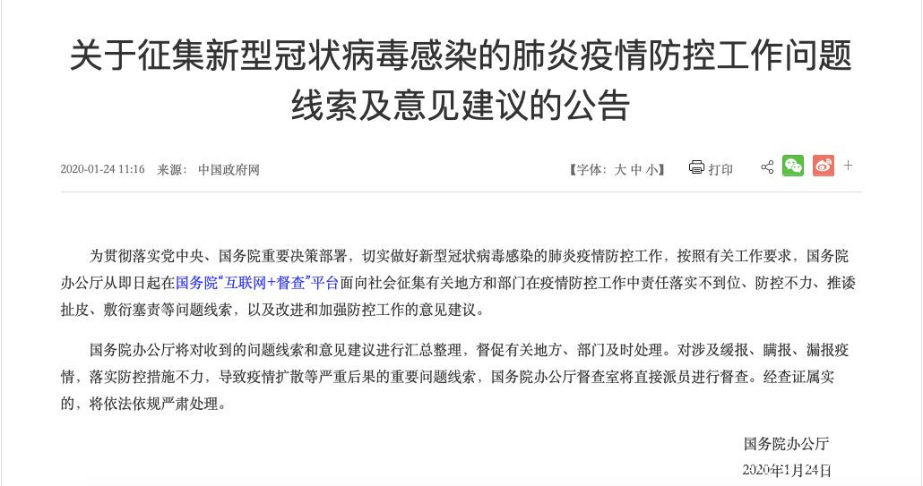 政知君注意到,1月24日,國務院辦公廳就印發了《關於徵集新型冠狀病毒感染的肺炎疫情防控工作問題線索及意見建議的公告》。