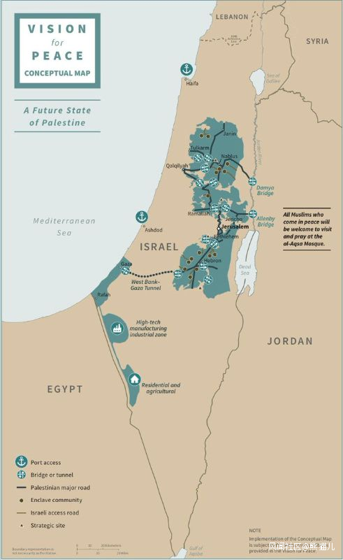 特朗普最近公佈了早在去年就已經被討論的沸沸揚揚的“中東和平計劃”,這個計劃是他的女婿庫什納搞出來的,計劃一出,成千上萬的巴勒斯坦人在加沙地帶抗議,計劃如下: