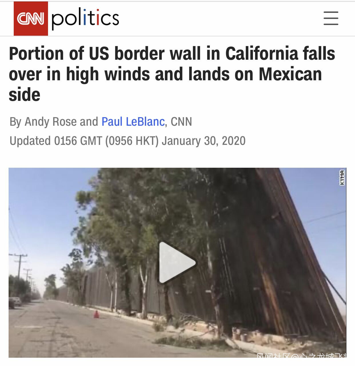 [環球網報道 記者 崔舒飛]美國有線電視新聞網(CNN)30日發佈了一段視頻,畫面中顯示,一段美墨邊境牆已經被大風吹倒,正壓在墨西哥一側公路旁的幾棵樹上,牆的另一側是正在進行作業的工程車。