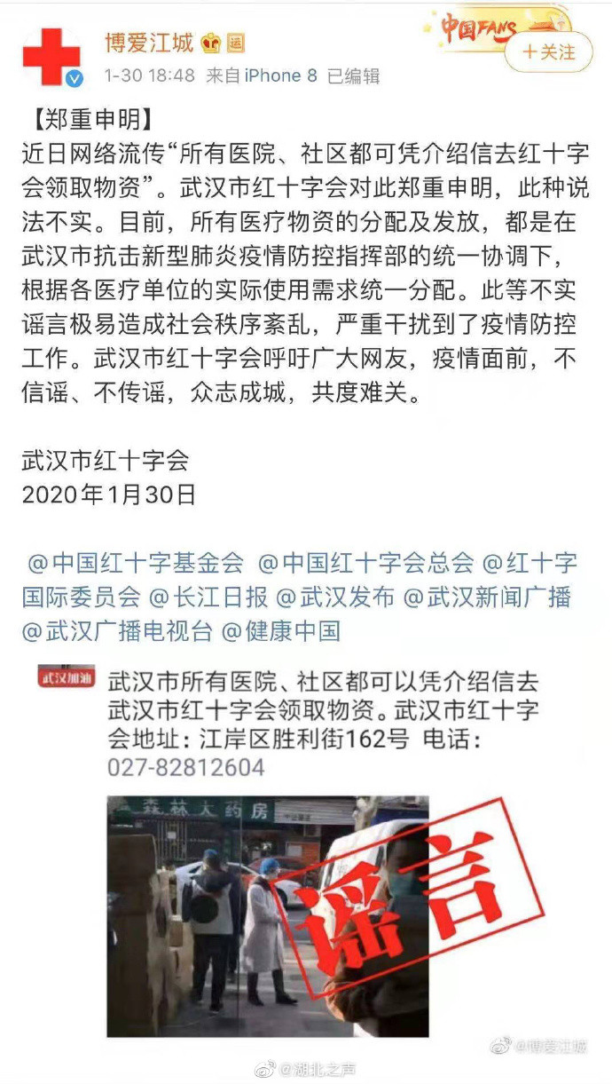 拿介紹信可到武漢市紅十字會領取物資? 假的!假的!來源:湖北之聲