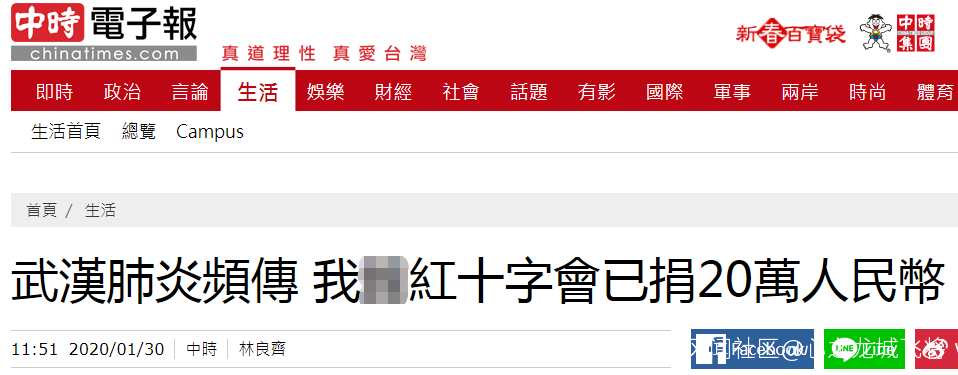 台灣紅十字會向大陸捐款20萬人民幣 用於新冠肺炎防控2020年01月30日 14:00:12來源:環球網