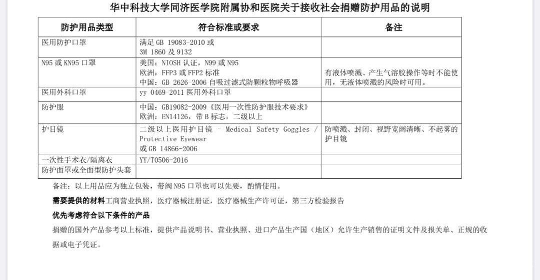 武漢協和醫院關於接收社會捐贈防護用品的説明截圖。