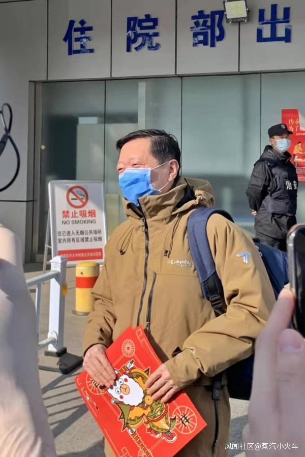 今天,記者在地壇醫院住院部出入口看到剛剛走出病房的王廣發,他戴着藍色口罩,看上去精神狀態不錯,守候在門口的醫生還送上了代表“吉祥”的紅色貼畫。