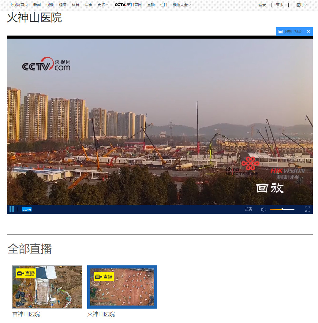 另一個是也是央視的,欄目叫直播中國,也是用網頁瀏覽觀看方式,電腦,手機都可以的,火神山醫院鏡頭是固定的,雷神山醫院鏡頭是旋轉的大約有120度左右,與央視頻的角度和方位不同的,感覺是央視頻直播的補充的,
