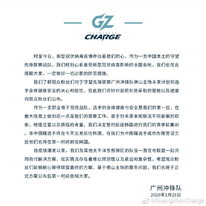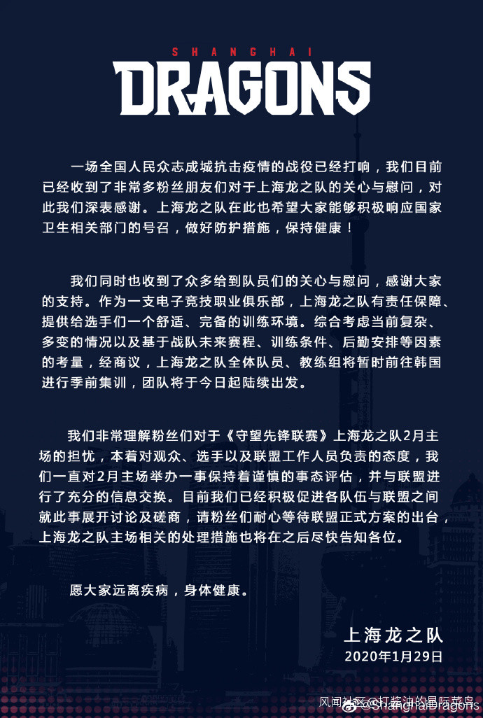 除了比賽延期或取消以外,還有部分戰隊為了確保旗下隊員(包括一批外籍隊員)安全,宣佈全隊轉移到韓國進行賽前訓練。