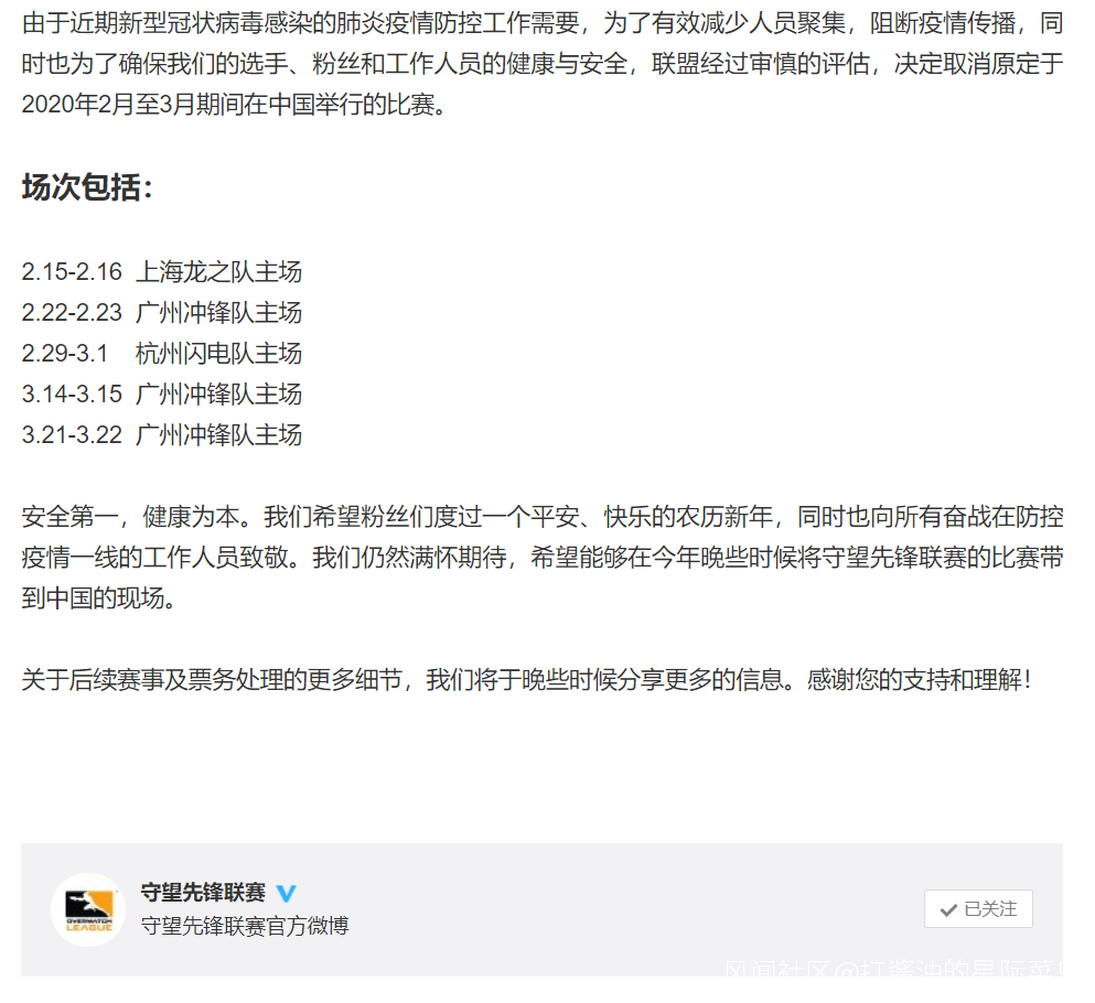 接下來就是以及在數個月前就確定中國戰隊主場周賽程和舉辦場館的守望先鋒聯賽(OWL),根據聯賽公告,原定於2020年2月至3月在中國地區舉辦的5箇中國城市主場週末活動全部取消。