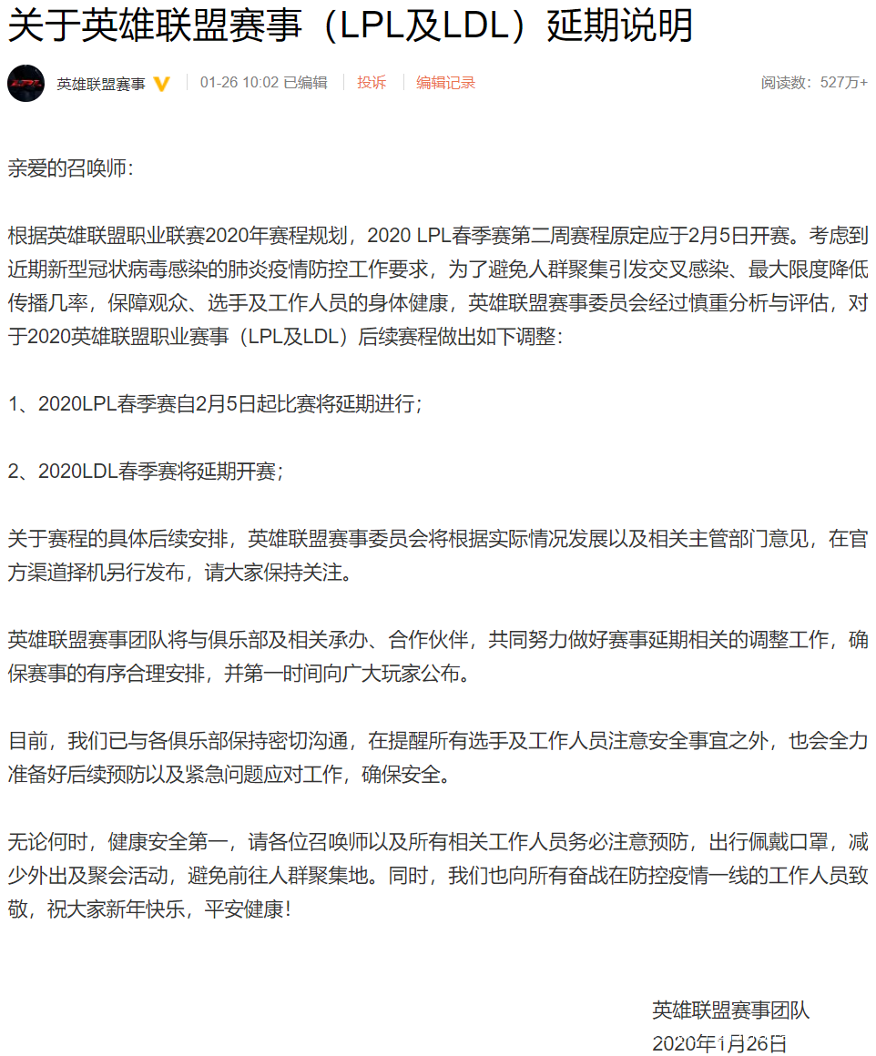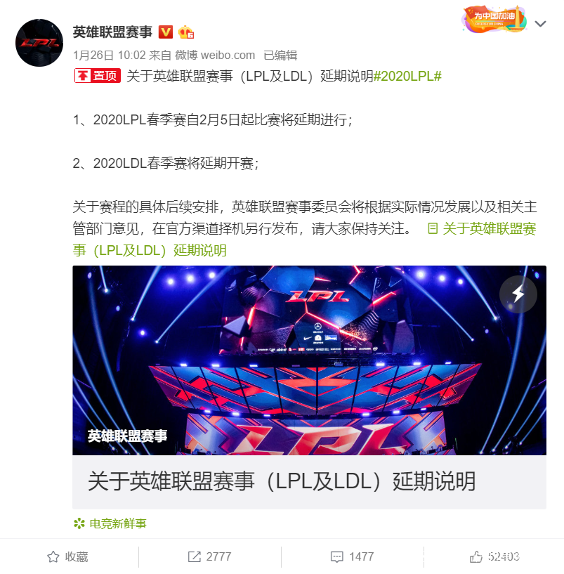 首當其衝的,就是LOL中國大陸區的兩級聯賽——LPL和LDL。1月26日,微博@英雄聯盟賽事 發佈官方公告,宣佈2020LPL春季賽自2月5日起比賽將延期進行;作為次級聯賽的2020LDL春季賽也將延期開賽。