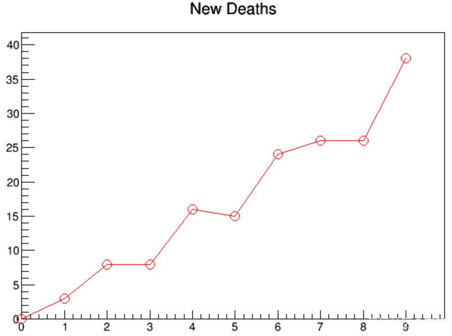 圖2:每天新增加的死亡人數,前8天幾乎在線性增加,且在6-8天有趨於飽和的平台趨勢,但是今天(第9天)的數據顯示死亡人數又再次拉昇。