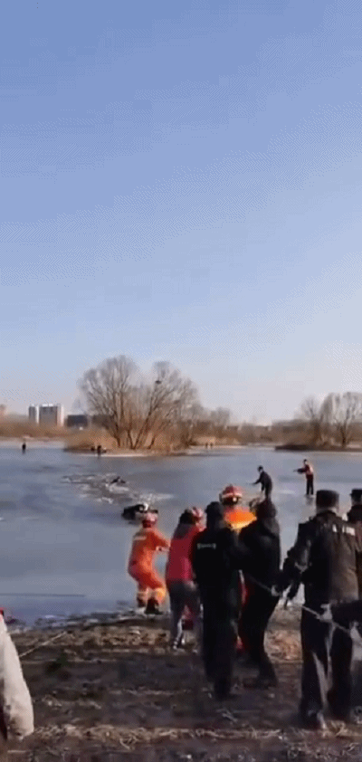 昌平公安分局松園派出所的副所長杜寶偉,冒着生命危險接近那仨傻缺,結果就在剛剛要接近的時候,冰面破了。