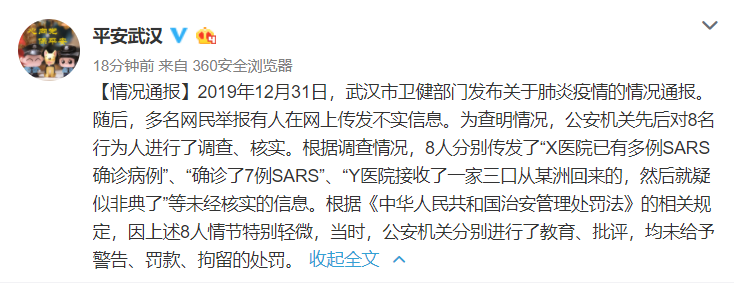 2019年12月31日,武漢市衞健部門發佈關於肺炎疫情的情況通報。隨後,多名網民舉報有人在網上傳發不實信息。為查明情況,公安機關先後對8名行為人進行了調查、核實。根據調查情況,8人分別傳發了“X醫院已有多例SARS確診病例”、“確診了7例SARS”、“Y醫院接收了一家三口從某洲回來的,然後就疑似非典了”等未經核實的信息。根據《中華人民共和國治安管理處罰法》的相關規定,因上述8人情節特別輕微,當時,公安機關分別進行了教育、批評,均未給予警告、罰款、拘留的處罰。