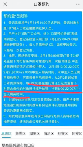 “以前在廈門購買口罩僅需要憑身份證到廈商超市等各大售賣點進行購買,但如果排隊較多、人員聚集,就很容易產生交叉感染。所以現在廈門市政府統一組織對購買方式進行了調整,現在廈門全市的口罩都需要在這個登記系統進行預約、搖號,然後分配購買口罩的時間。中籤的市民憑身份證在分配的購買時間、分批前往預約的商店進行購買,這樣可以減少交叉感染的情況。”