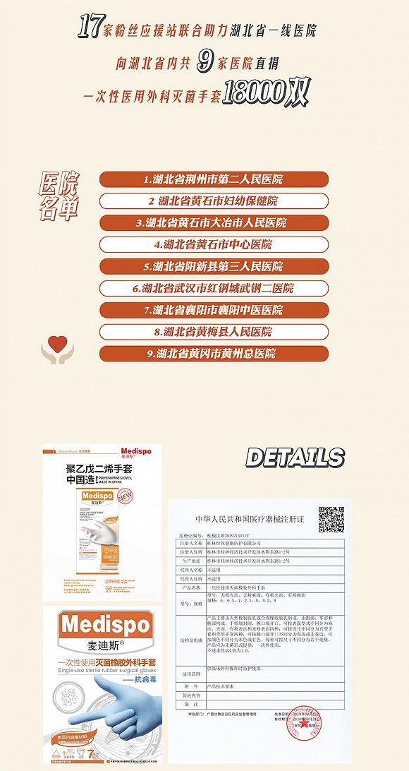 第一批1.2萬雙一次性醫用滅菌外科手套是劉憲華小C應援站的粥粥找到的。找到資源的那天正值除夕,我們掃完了廠商的所有可供現貨,並在當天發出,隔天就到達了武漢的醫院。之後我們又在網絡上找到了1000份面罩。第二批手套的貨源來自於韓娛站子JSHINE李鍾碩。現在我們即將從海外運回的8200套防護服來自於肖戰公益站小愛的朋友。
