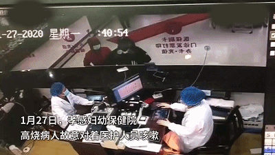 1月27日,湖北省孝感市婦幼保健院內一名男子,高燒4天來醫院看發熱門診,因醫院沒有藥,便摘下口罩故意對着醫院工作人員咳嗽。