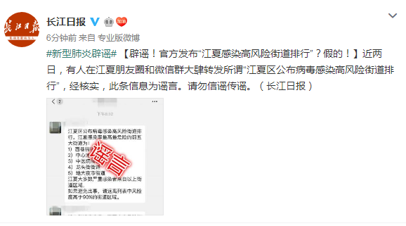 近兩日,有人在江夏朋友圈和微信羣大肆轉發所謂“江夏區公佈病毒感染高風險街道排行”,經核實,此條信息為謠言。請勿信謠傳謠。(長江日報)