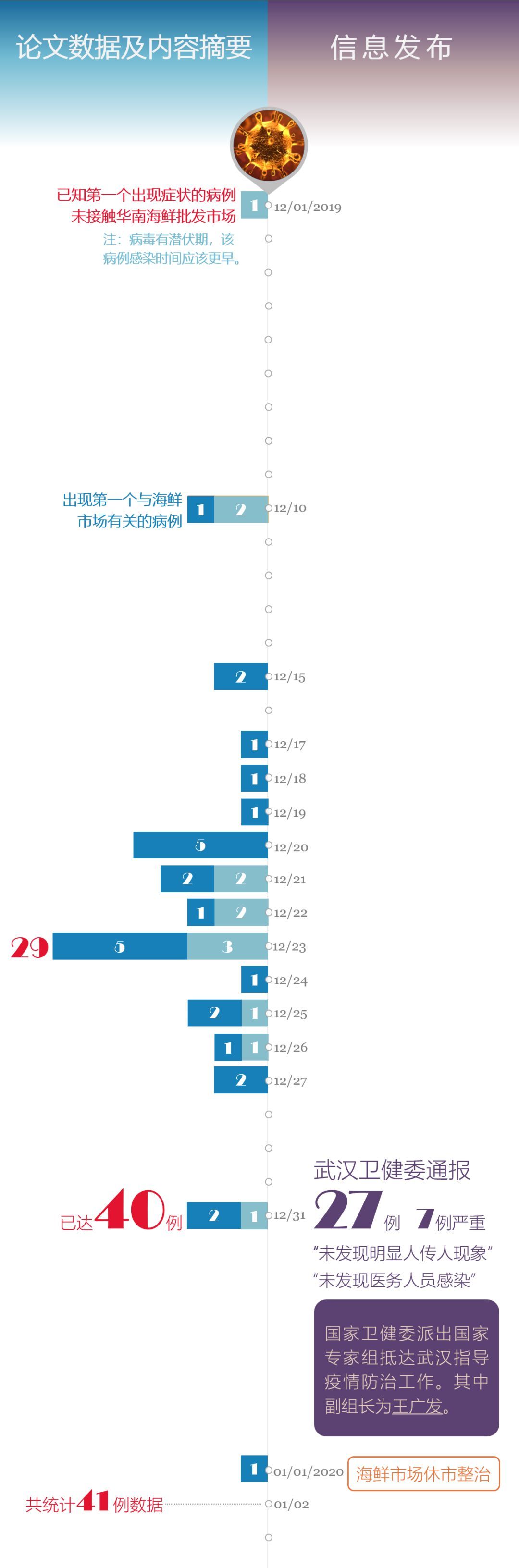 2020年1月24日,國際頂級醫學期刊The Lancet(《柳葉刀》)發表了題為Clinical features of patients infected with 2019 novel coronavirus in Wuhan, China(《中國武漢地區2019年新型冠狀病毒感染者的臨牀特徵》)的文章。文章詳細記錄、分析了疫情初始階段41名病例的臨牀資料。我們抽取了這些病例的時間分佈信息,並與各正規渠道發佈的信息比較,供讀者參考。