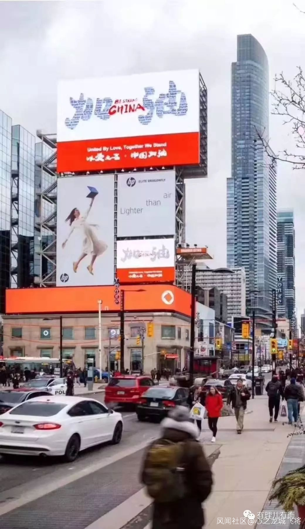 加拿大多倫多市中心還出現了巨幅廣告牌:“加油中國!以愛之名!我們挺你!”