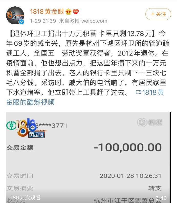 重慶87歲獨居老人捐出畢生積蓄20萬元,這筆錢她攢了30多年;瀋陽賣爆米花的老人50年攢2.5萬全捐醫院;杭州退休環衞工捐出10萬積蓄,卡里只剩13.78元;93歲老兵捐出存摺上的1萬5千塊錢,覺得錢不夠,向女兒借5千塊錢……