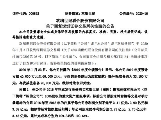 對於造成2019年度業績預虧的原因,歡瑞世紀(000892.SZ)2月10日晚間回覆深交所問詢時稱,主要原因是影視行業規範化調整帶來的營收下降,應收賬款壞賬準備計提金額大幅增加、存貨成本重估。