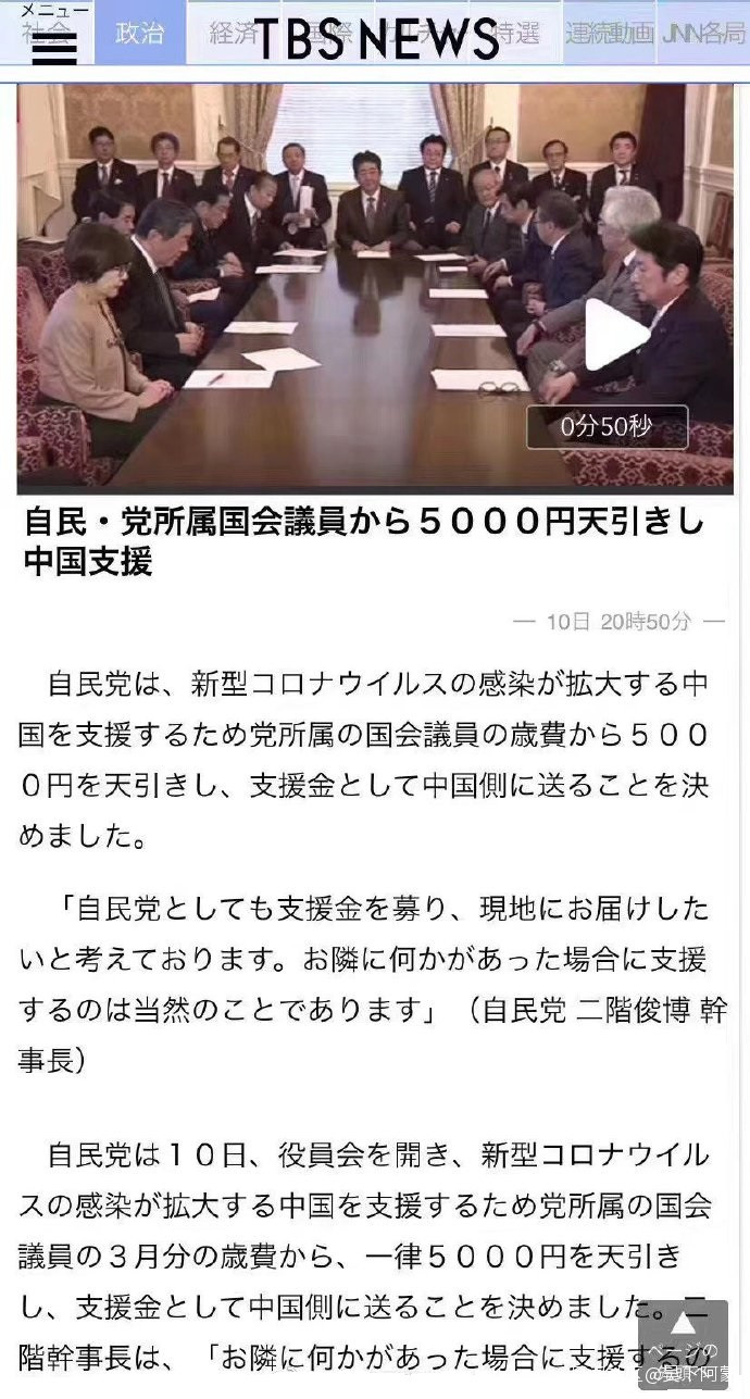 2月10日,以安培為首的日本自民黨在會上決定,該黨所屬397名國會議員將從每位國會議員的津貼中扣除5000日元,支援中國抗擊新型冠狀病毒肺炎疫情,總共將籌集200萬日元(約合12.7萬元)。