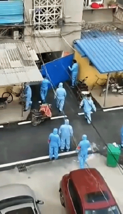 除了“隔離3個病區”的謠言,這兩天網上還流傳着一段“彭浦新村住宅樓被封閉隔離”的視頻。視頻中,多名身着防護服的工作人員,正在用一塊藍色板材將樓道封閉,與視頻一同流傳的文字則稱,“彭浦新村聞喜路935弄封樓了”。