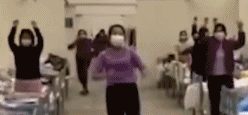一開始只是一兩位患者跳,後來隨着節奏聲,越來越多的患者從自己的病牀起身,加入跳舞的隊伍。