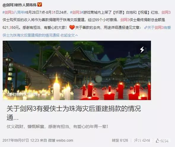 長大後自己真正意義上的第一筆依靠自己的捐款,其實是源於《劍網3》。2013年雅安地震時,《劍網3》就舉行過蠟燭祈福的活動,由玩家祈願,《劍網3》以玩家的名義為雅安進行捐款。到了2017年《劍網3》更是將蠟燭祈福活動轉換為了玩家募捐,當時中國珠海在3天內連續遭遇“天鴿”、“帕卡”兩個颱風,城市滿目瘡痍,損失慘重。《劍網3》在遊戲裏藉由“祈願”和“祝福”的蠟燭售賣形式組織起了玩家捐贈活動,最終在3天內籌集了62萬元助力珠海災後重建。