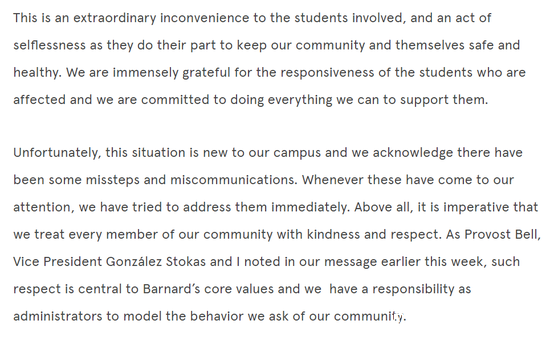 △ 2 月 6 日,巴納德學院院長萊斯莉·格里內基(Leslie Grinage)在官網上發表公開信函,肯定了相關中國學生配合隔離的行為,並承認學院可能存在不當操作和溝通中的誤解。圖片來源 | 巴納德學院官網 陳誠加入了他們討論如何交涉的社交網絡羣,他建議一定要説明,在學生們有恐慌情緒的前提下,就隔離期間學校的行為,學生們產生關於種族歧視的猜測和聯想都是正常的。他也建議強調,發生這些,是因為學校的隔離政策確實有很大的漏洞。