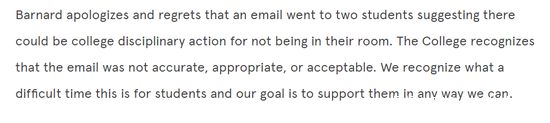 2 月 9 日,巴納德學院再次發佈公告,為先前郵件中的過激用詞道歉。