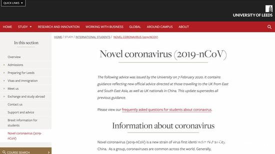 △ 利茲大學的官網上開設了針對此次疫情的網頁,學生及教職工提供指導。圖片來源 | 利茲大學官網