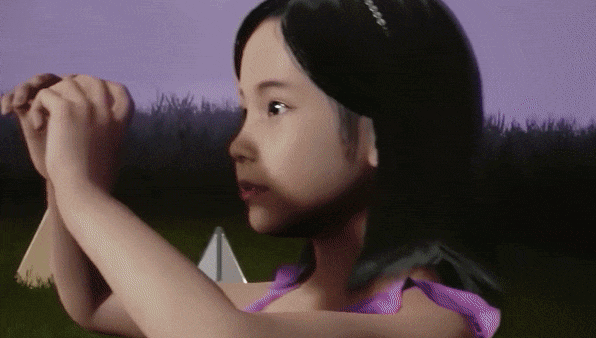 Nayeon穿着漂亮的紫色連衣裙和她最愛的綠色涼鞋,斜挎一個粉紅的小包,面向媽媽時眉眼間滿是笑意。而在另一邊,一滴滴淚水從黑色的、包裹嚴實的VR眼鏡中擠出,啪嗒啪嗒落在腳下綠色的幕布上。