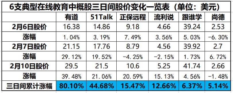 除了網易有道和51Talk,一直不温不火的正保遠程和股價一路滑向“深淵”的流利説,在這三天間都有了明顯增長。至於跟誰學和尚德,三天之間累計股價增幅都在個位數,平時看來尚可,特定時期毫不起眼。