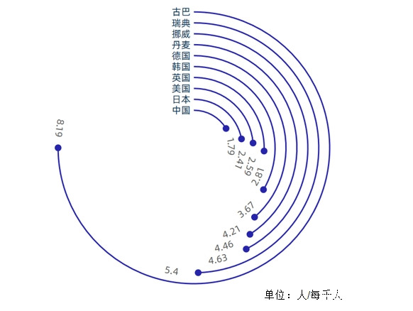 據CIA World Factbook統計(統計口徑與國內不同,醫生密度:每1000人中醫生的數量,包括綜合醫師和專科醫生),截至2019年1月,古巴的醫生密度最高,為每千人8.19;在五個北歐國家中,有三個醫生密度在世界前十,分別為瑞典、挪威、丹麥,這些國家的醫生密度均在4以上。而我們熟知的英美與日韓,其醫師密度分佈在2.41到3.67之間。在這份統計中,中國的醫師密度為1.79,在197個國家中排名90,位於中游。