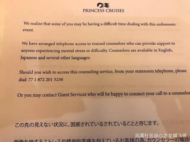 △ 鑽石公主號上分發的心理諮詢熱線。圖片來源 | Gay&Phil Courter