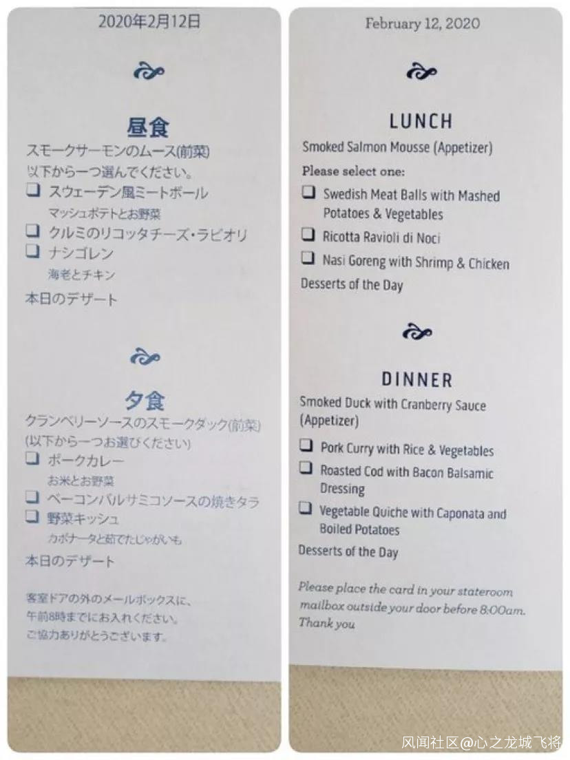 △ 船上提供的餐食菜單。圖片來源 | Twitter @daxa_tw