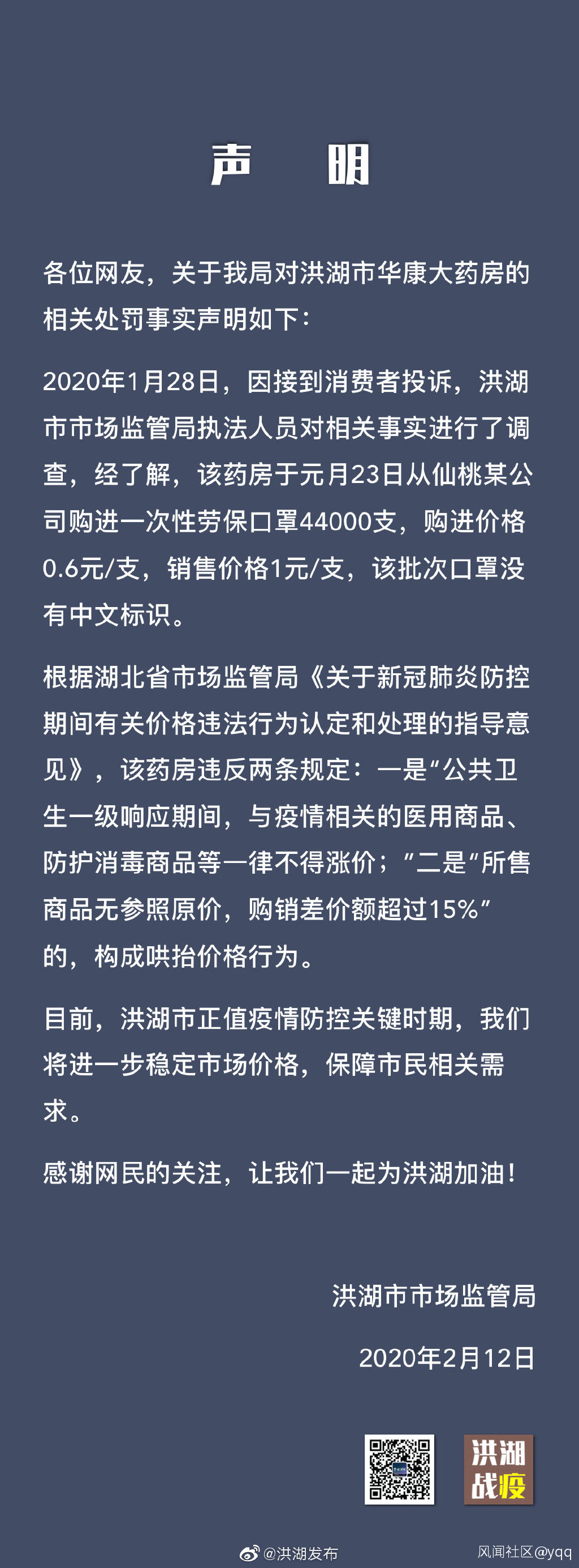 湖北洪湖一藥房被罰:將0.6元進價口罩賣1元,涉嫌哄抬價格,原文