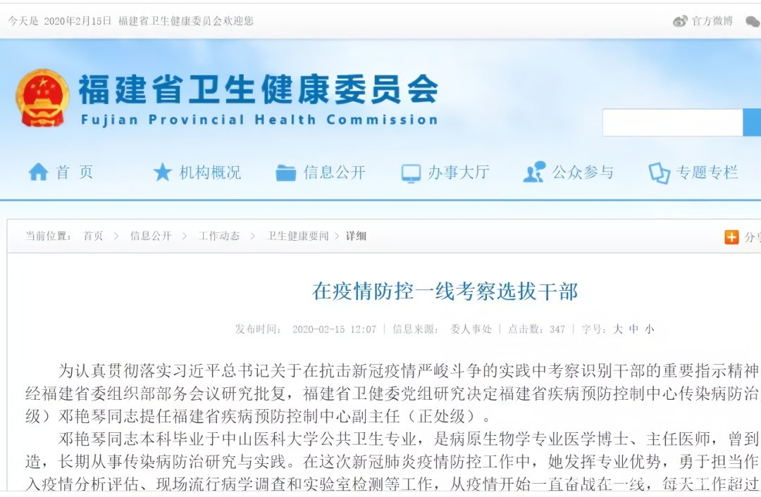 9人蔘與4評論2月15日,福建省衞健委網站通報,近日,經福建省委組織部部務會議研究批覆,福建省衞健委黨組研究決定福建省疾病預防控制中心傳染病防治所所長(副處級)鄧豔琴同志提任福建省疾病預防控制中心副主任(正處級)。