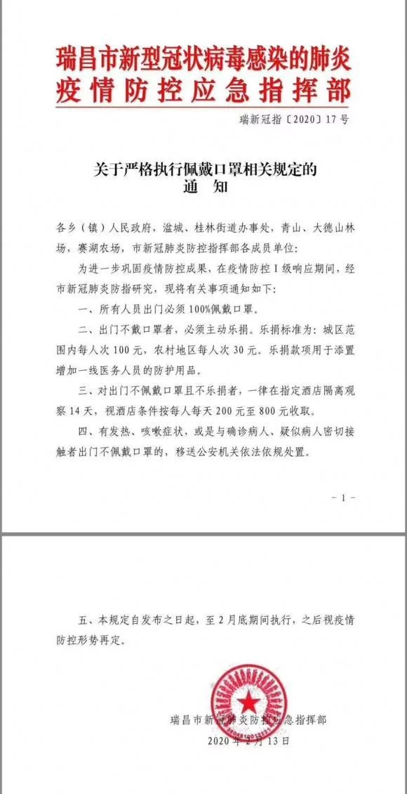 唯恐天下不亂!!!江西瑞昌:出門不戴口罩者須主動捐款 否則隔離14天(快資訊)_風聞