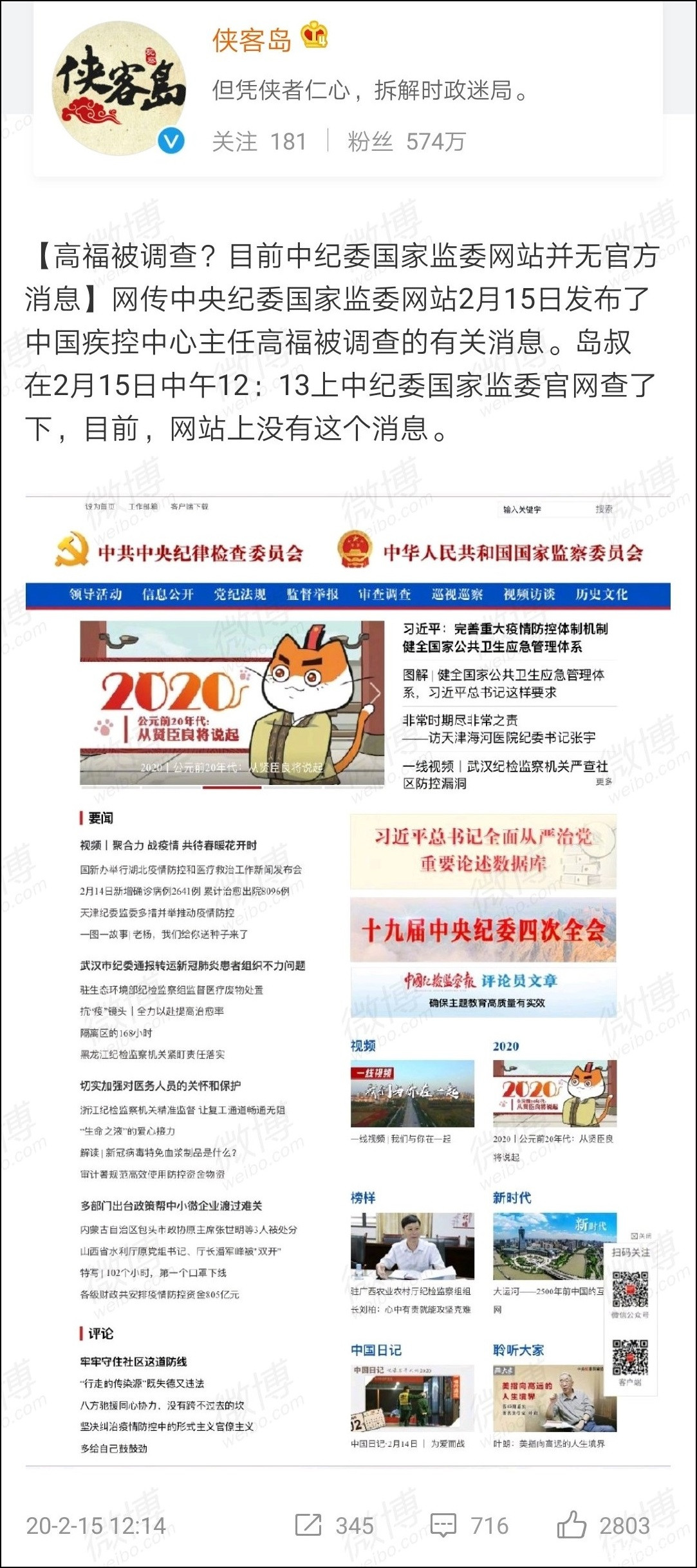 稍晚時分,人民日報海外版旗下賬號@俠客島 進行求證,稱:12時13分許,在中央紀委國家監委網站上並沒有查詢到高福被調查的消息。