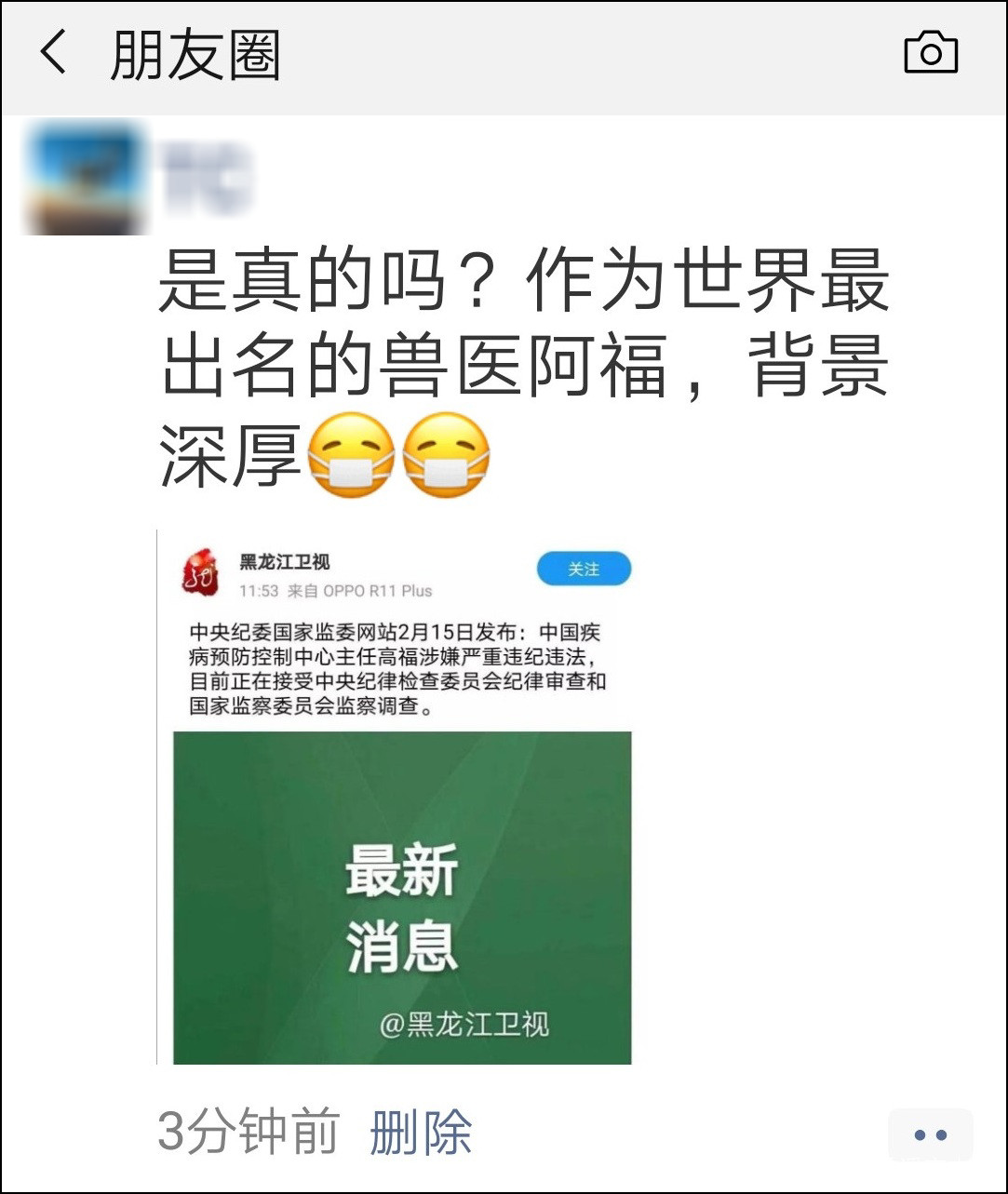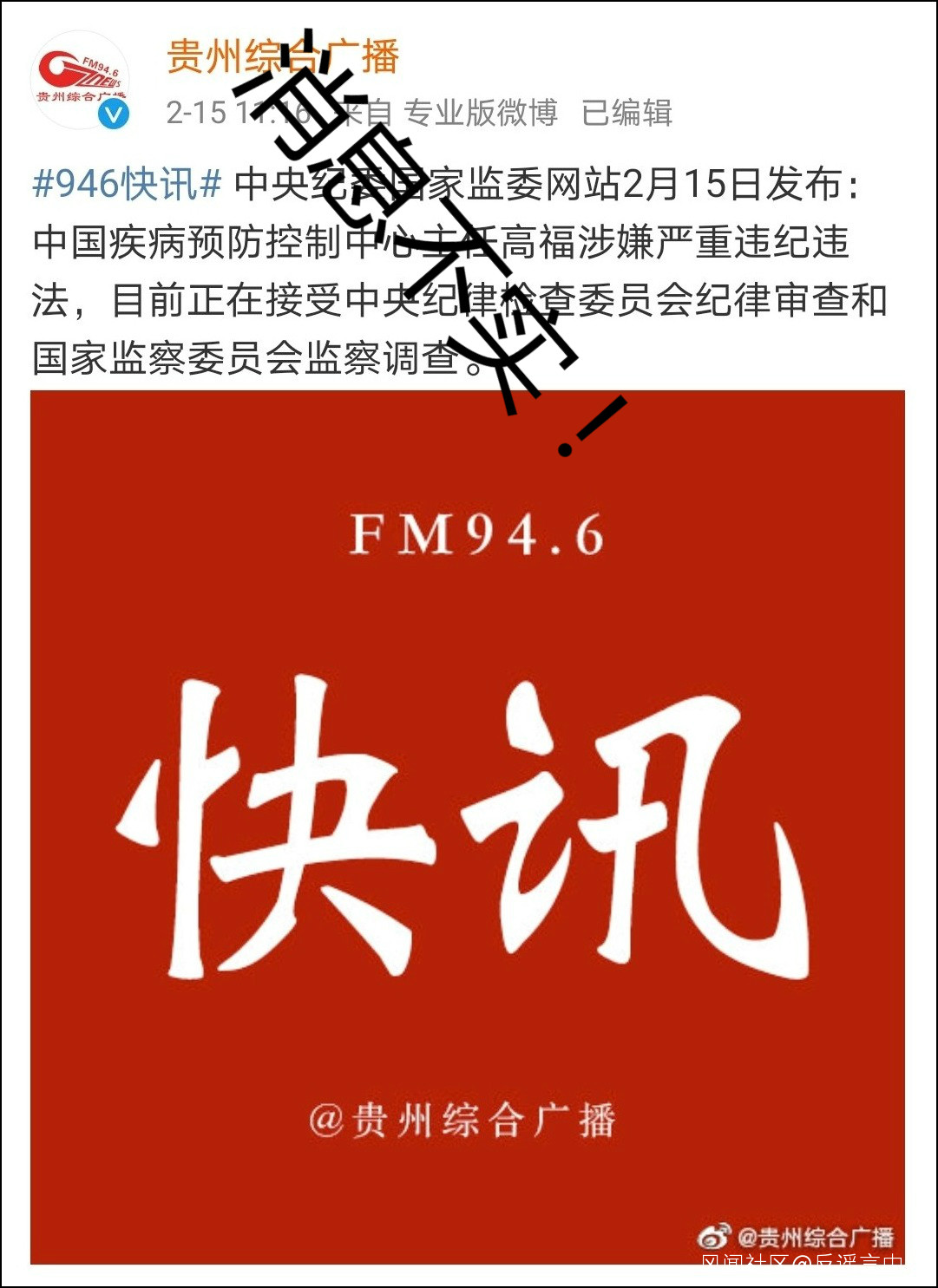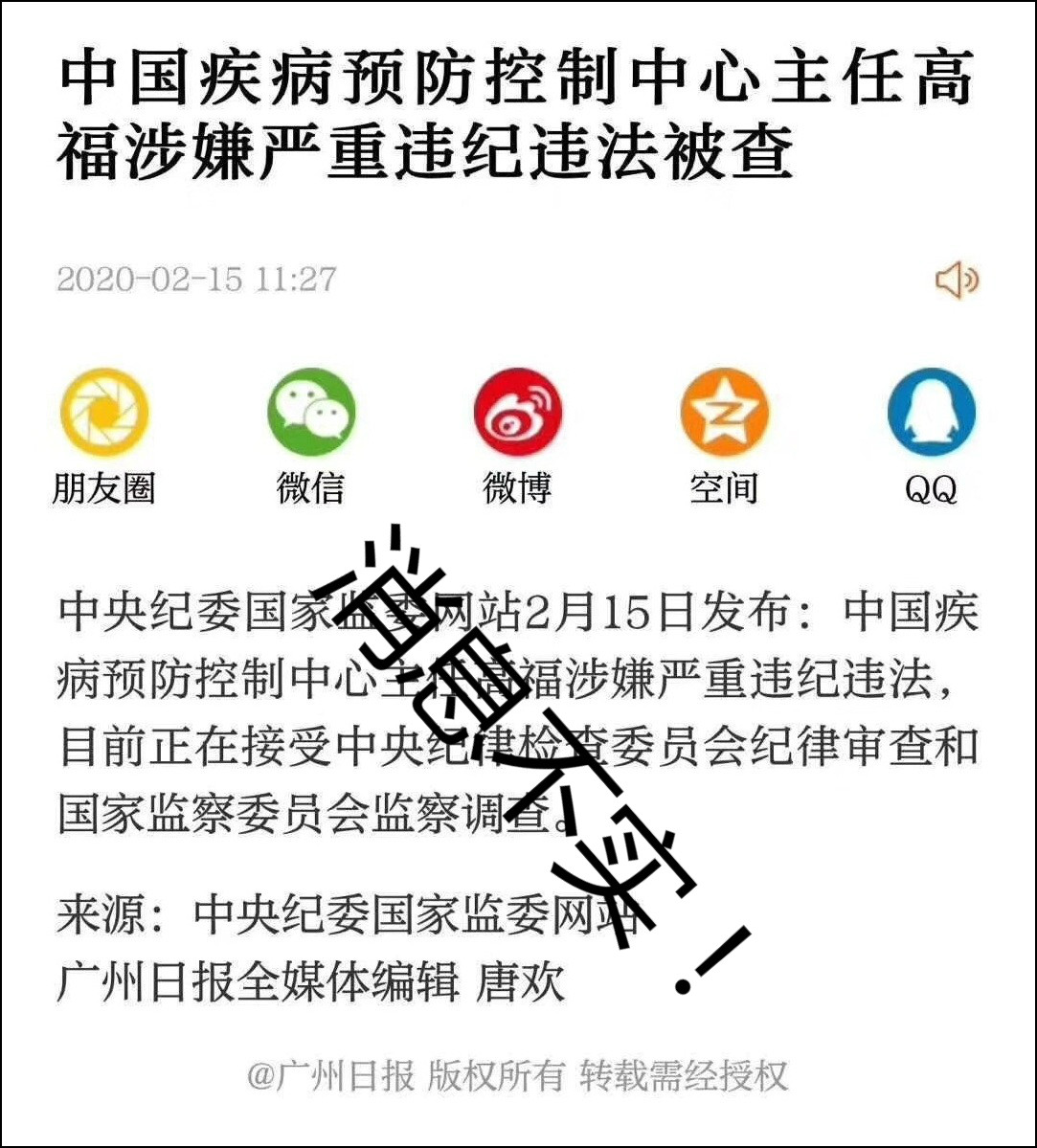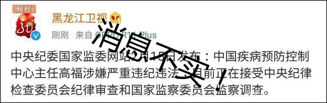 2月15日早,社交網絡上流傳着一則國家疾控中心高福被調查的消息。