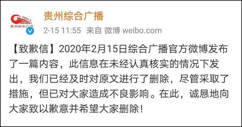 不過沒有多久,@貴州綜合廣播 就率先刪除了微博,並致歉: