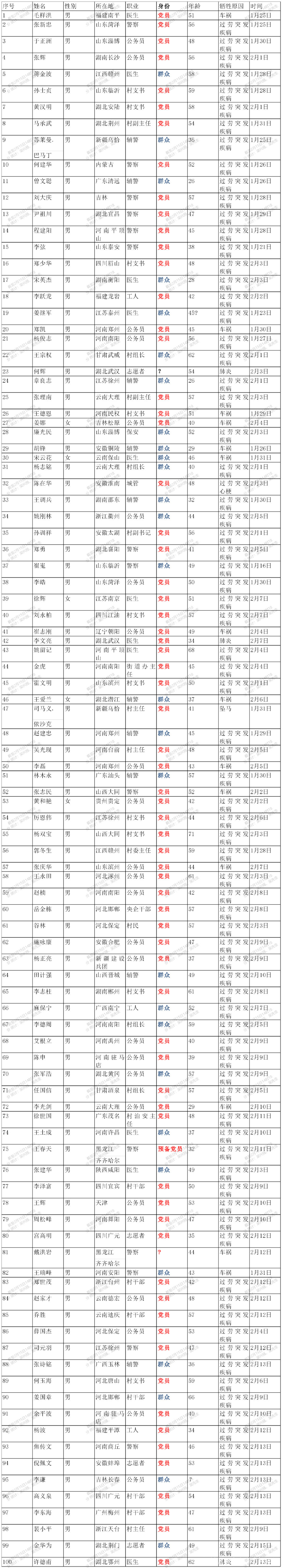 讓我們記住他們的名字,以下為詳細名單,如果你願意,請儘可能擴散,讓更多人知道有人為我們付出了生命,因公殉職100名,其中黨員70名,村幹部(含村黨員)29人,公務員(含幹部,非警)26人,警察(含輔警)24人,醫生11名,志願者4名,工人(含央企幹部)4名,城管1名,保安1名: