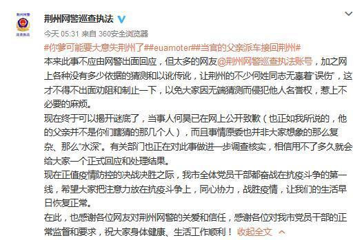 今天凌晨4時許,該網友在微博中發表道歉書,回應“自稱被當官的父親派車接回荊州”和“2019年支付寶賬單”一事。該網友自稱: