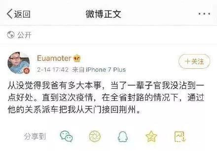 該網友自稱,在湖北全省封路的情況下,其當官的父親動用關係,派車將自己從湖北天門市接回了荊州市。