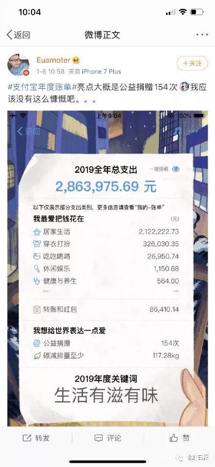隨後,該網友被扒出曾曬自己的支付寶年度賬單,圖片顯示其2019年全年總支出達286萬餘元。