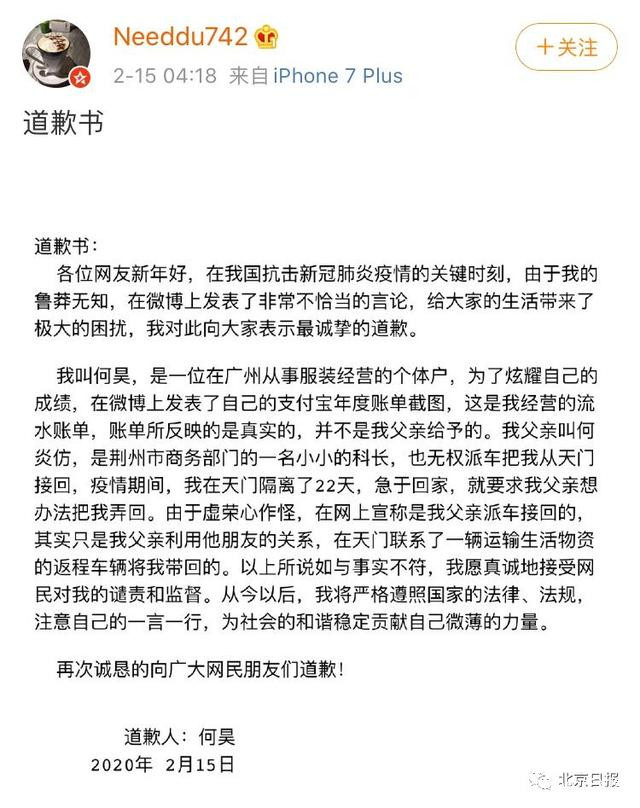 由於我的魯莽無知,在微博上發表了非常不恰當的言論,對此向大家表示最誠摯的道歉。我是一位在廣州從事服裝經營的個體户,為炫耀自己的成績,在微博上發表了支付寶年度賬單截圖,這是我經營的流水賬單,賬單所反映的是真實的,並不是我父親給予的。我的父親是荊門商務部門的一名科長。由於虛榮心作怪,(我)在網上宣稱是我父親派車接回的,其實只是我父親利用他朋友的關係,在天門聯繫了一輛運輸生活物資的返程車輛將我帶回的。