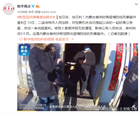 當日訴、當日判!內蒙古首例妨害疫情防控刑事案件宣判來源:新華視點微博